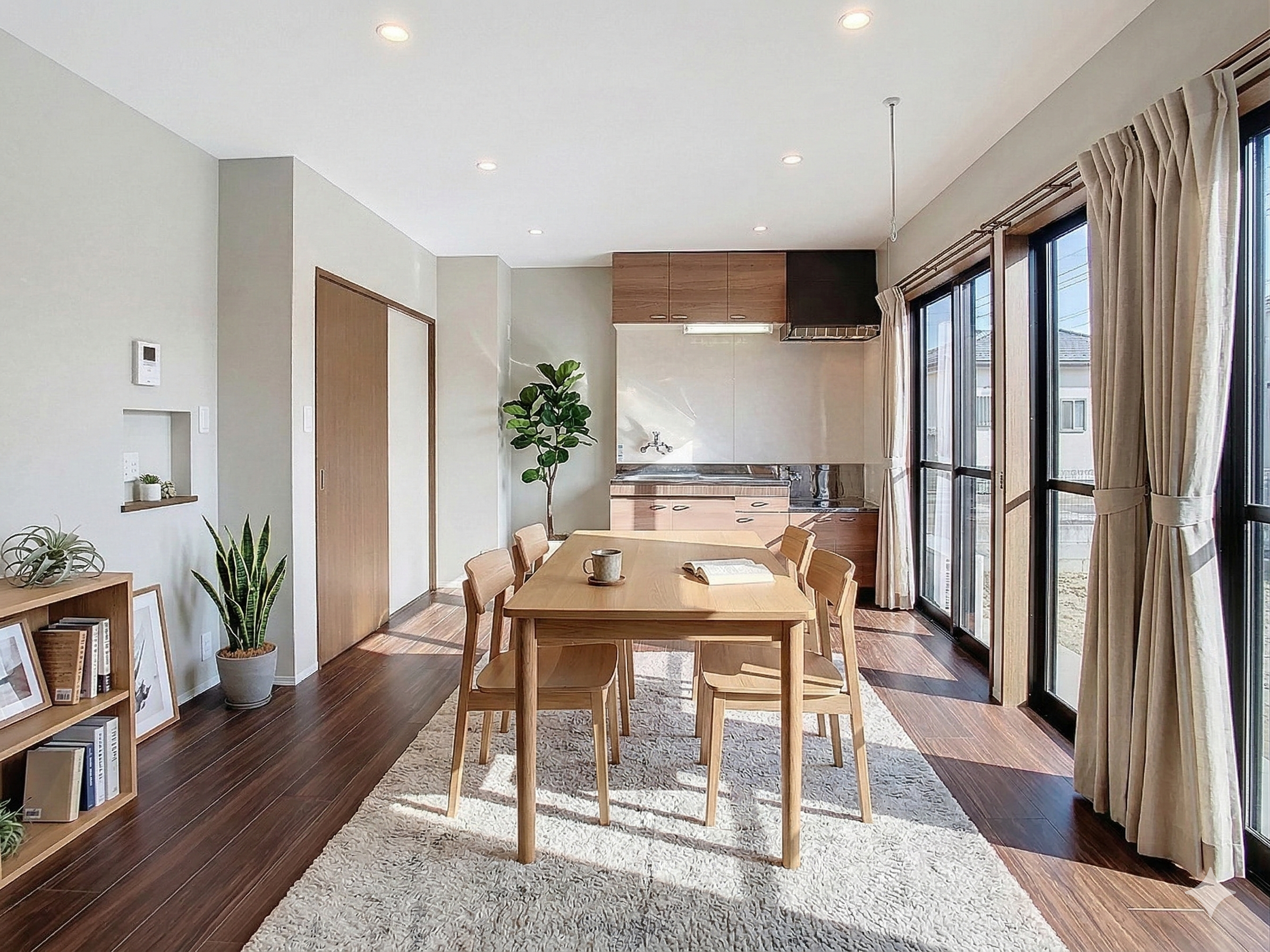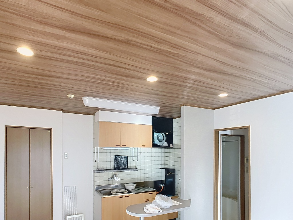 LDKでは、天井の照明をダウンライトに変更し、天井クロスも木目のアクセントクロスに変更することで、空間全体に統一感を持たせました。